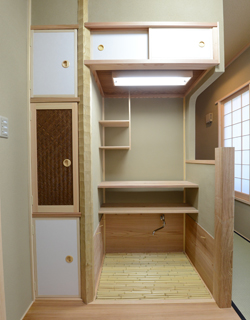 栗化粧柱はナグリ仕上げ、水屋としての設えは、小型ながら十分機能